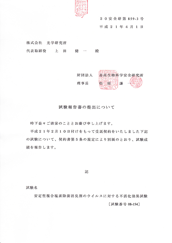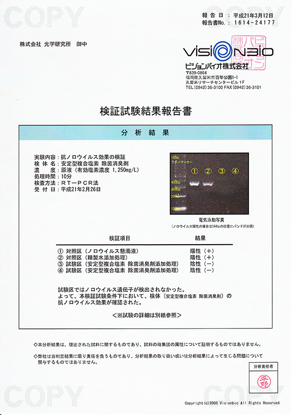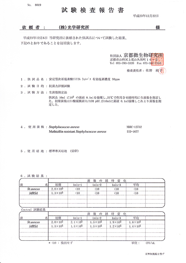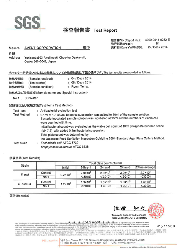 3D Water instantly inactivates viruses and bacteria by decomposition of their protein component. Its anti-bacterial function is proven to be effective in seasonal influenza, SARS virus, parvovirus in animals, norovirus and O-157 in food poisoning.In addition, with the effective chlorine concentration for antibacterial properties, 3D water could instantly disinfect over 99% of bacteria. SSH is also effective in dealing with airborne virus, virus attached to materials, or virus floating around, thus making it effective for infection prevention.